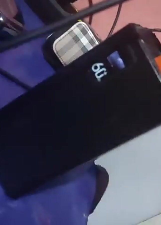 black power bank charging on a blue surface. It displays 60% charged on its screen. A black charging cable is connected to it. Next to it are a black wireless mouse and a charging adapter with a plaid design. The background includes a pink wall with circular shadows. The camera rotates slightly to show more of the objects on the surface.