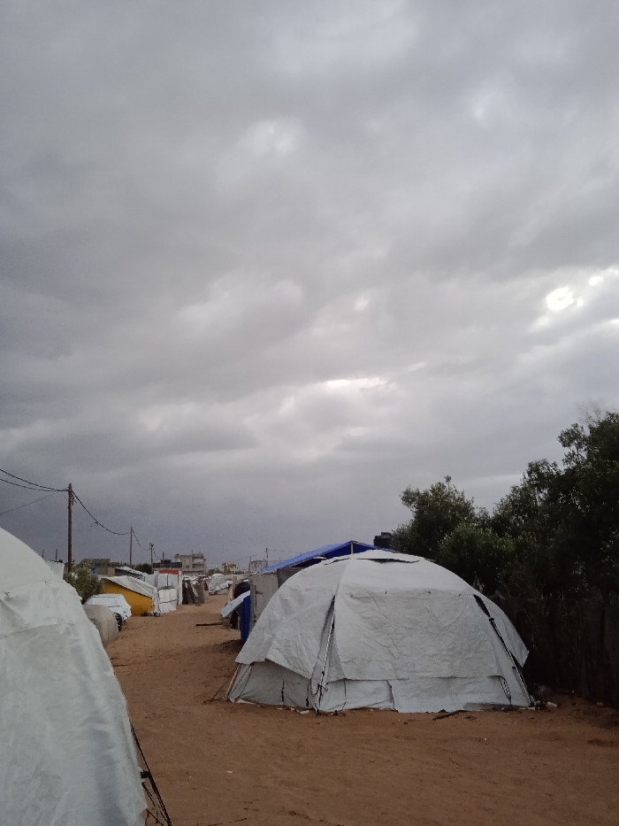 - "A somber scene unfolds under a heavy, overcast sky, where multiple white tents stand on bare ground, likely a camp" by FM-taMrd2, licensed under CC BY 4.0