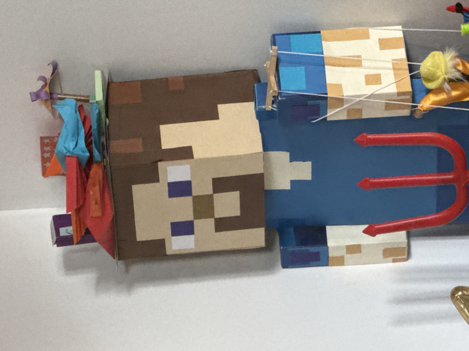 The image displays a large, blocky, three-dimensional representation of the Minecraft character 'Steve,' constructed from cardboard or similar material