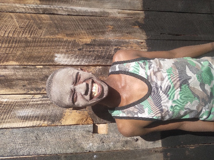 An image captured in Nyeri, Kenya, features a young male subject positioned centrally, facing forward, against a weathered vertical wooden plank wall. His head and face are extensively coated with a light-colored, granular substance, consistent with dust or ash. He displays a broad smile, exposing both maxillary and mandibular teeth, with his eyes narrowed. The subject is attired in a camouflage-patterned sleeveless tank top, exhibiting shades of green, grey, and white, accented by black trim. Traces of the powdery substance are also visible on his exposed neck, shoulders, and arms. The wooden background consists of vertically oriented planks varying in color from light grey-brown to dark brown, displaying prominent wood grain and localized darkening. Strong, directional sunlight illuminates the scene, creating distinct shadows on the left side of the subject and along the lower right section of the wall.