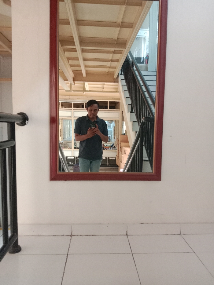 A rectangular mirror with a brown frame hangs on a white wall. The mirror reflects a man looking at his phone. The reflection shows the man wearing a dark shirt and jeans, standing in what appears to be a construction site or unfinished building, with wooden beams and a staircase visible in the background. The floor in front of the wall is tiled with white squares.