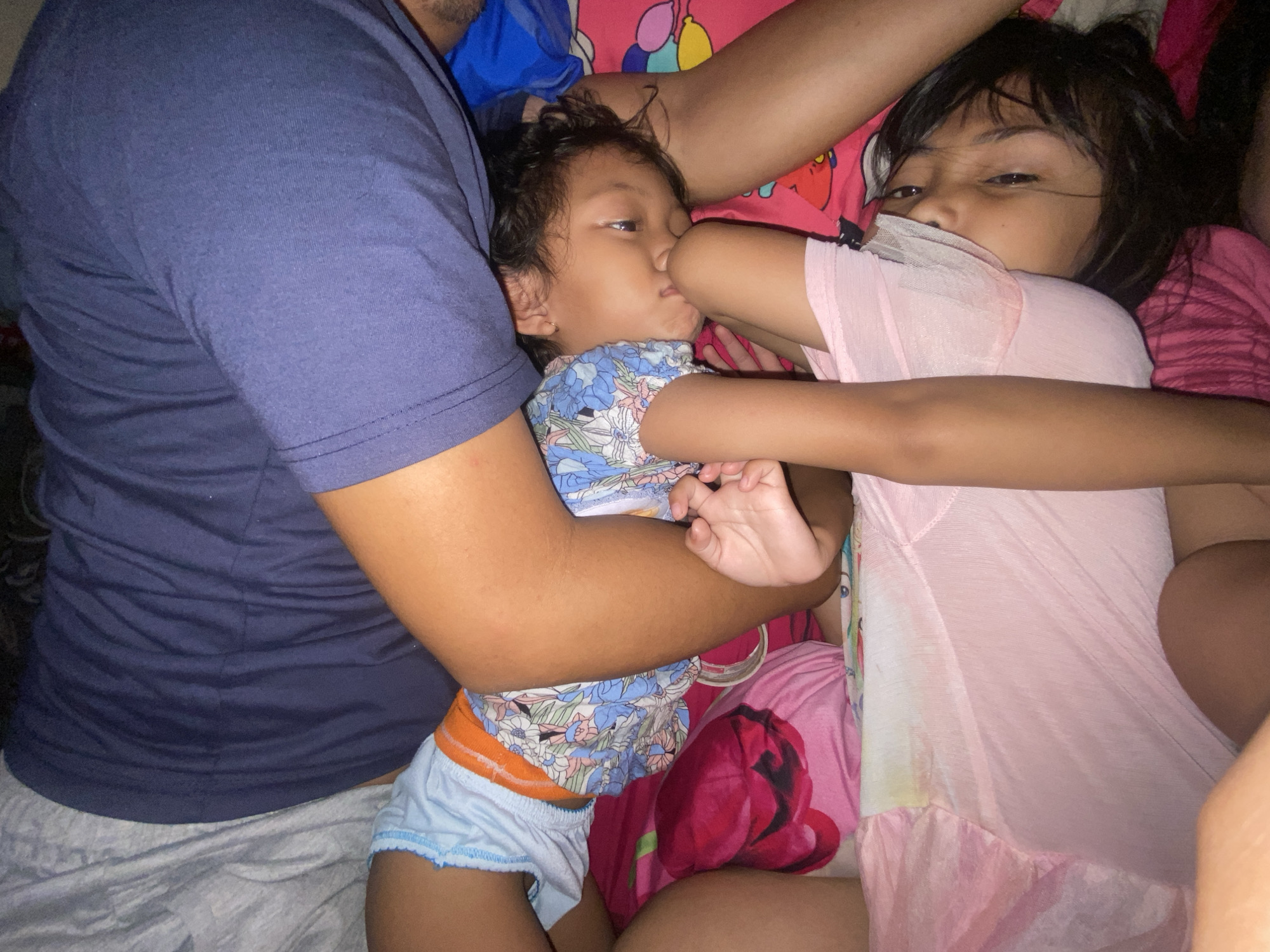 A close-up captures a family moment. A child in blue floral attire nurses while nestled in the arm of an adult wearing a navy shirt. A second child, in pink, lies nearby, eyes open, looking at the camera. They are surrounded by patterned bedding in shades of pink and white. The scene exudes intimacy and comfort.