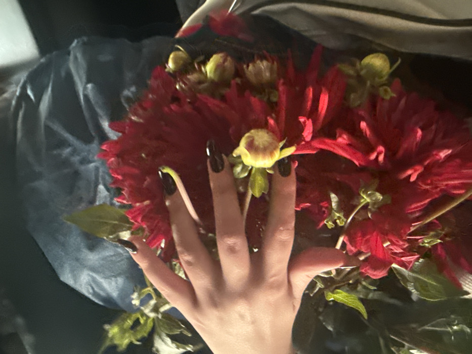 - "A dimly lit, close-up image shows a pale-skinned hand, adorned with black nail polish and neon green tips on some nails, resting upon a large bouquet of vibrant deep red dahlia-type flowers" by FM-ojRhr2, licensed under CC BY 4.0