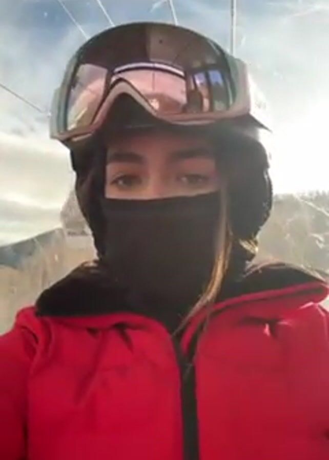 A person wearing a red ski jacket, black face covering, ski goggles, and helmet is seen from the chest up. The person is on a ski lift that is moving. The person's eyes are visible. The background consists of snow covered ground, trees, and the ski lift's support towers. The sky is visible above.