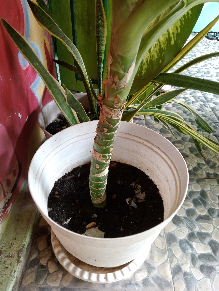 A potted Dracaena fragrans stands on a tiled surface. The plant features a thick, green stalk with visible segments and a cluster of striped leaves emerging from the top. Dark soil fills the white plastic pot. A smaller potted snake plant is visible in the background with its pointed, yellow-edged leaves. The scene is situated near a wall with peeling paint, suggesting an indoor or covered outdoor space.