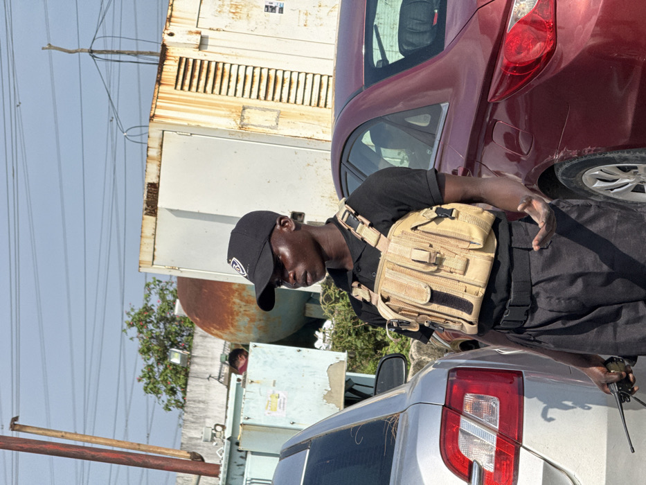 An outdoor, daytime scene in Ajah, Nigeria, features a male individual of apparent African descent, standing between two parked sedans. He is positioned centrally, facing slightly to his right (viewer's left), with a neutral expression. He wears a black polo shirt, black trousers, a black belt, and a black baseball cap with a white logo. Over his shirt, he wears a tan/beige chest rig equipped with multiple pouches. In his left hand, he holds a black two-way radio. His right hand is held open, palm upwards, at waist level. To the individual's immediate left, the rear quarter and taillight of a silver sedan are visible. To his immediate right, the rear quarter and taillight of a dark red sedan are visible. In the background, from left to right, are several structures under a clear, light blue sky traversed by overhead power lines. These include two rusted metal poles, a light blue/grey utility box, and a prominent rusted cylindrical metal tank. Behind the utility box and wall, a partial human figure is visible. Further right, behind the red sedan, is a white, heavily rusted corrugated metal structure, possibly a generator housing. Green foliage is present between and behind some of these structures.