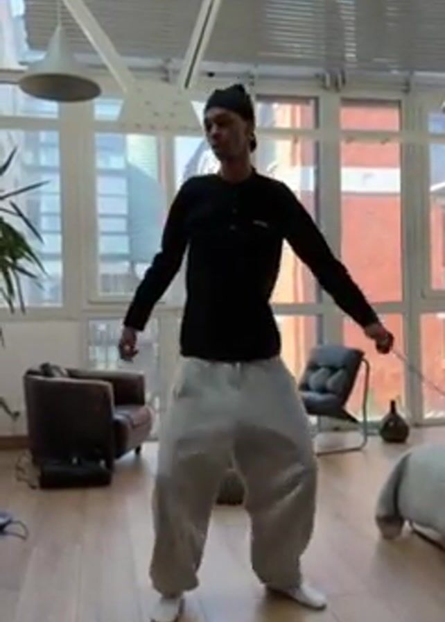 A slender, young Black man is dancing in a spacious, contemporary-style apartment