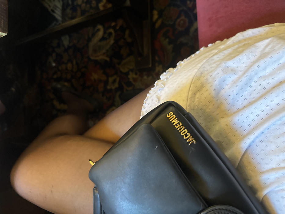 A partial view features a person seated with a black "JACQUEMUS" branded handbag resting on their lap. The person wears a white, textured top with a ruffled edge. Dark, patterned flooring is visible under what appears to be a table or chair leg. The lighting is mixed, showing bright areas on the skin and shirt and darker regions around the flooring and handbag.