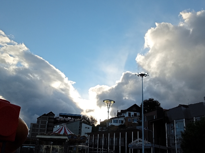 A cityscape with modern buildings and homes on a hillside under a dramatic sky. Cumulus clouds dominate, casting shadows. Two distinct street lights pierce the skyline. A circus tent-like structure is at the base of the hill, suggesting an amusement area. The sun peeks through the clouds, creating a bright contrast. A portion of a red structure is visible in the lower left.
