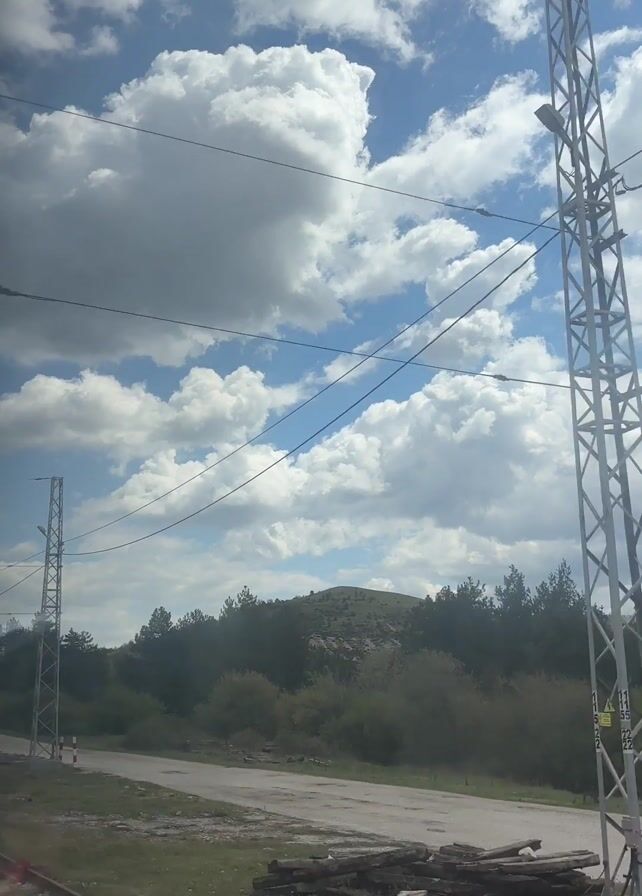 The video presents a view from a moving train, showcasing the landscape outside. The sky is bright blue with scattered, fluffy white clouds, which dominate the view. In the lower half of the frame, there are patches of green grass, a paved road, and a line of trees forming a forest edge. The terrain slightly rises toward a small hill in the center of the horizon. Railway tracks are visible in the foreground, passing alongside the road. The train passes a series of metal utility poles with overhead wires. Stacks of concrete blocks and a few metal containers are briefly seen near the tracks. The video is shaky, consistent with the movement of the train.