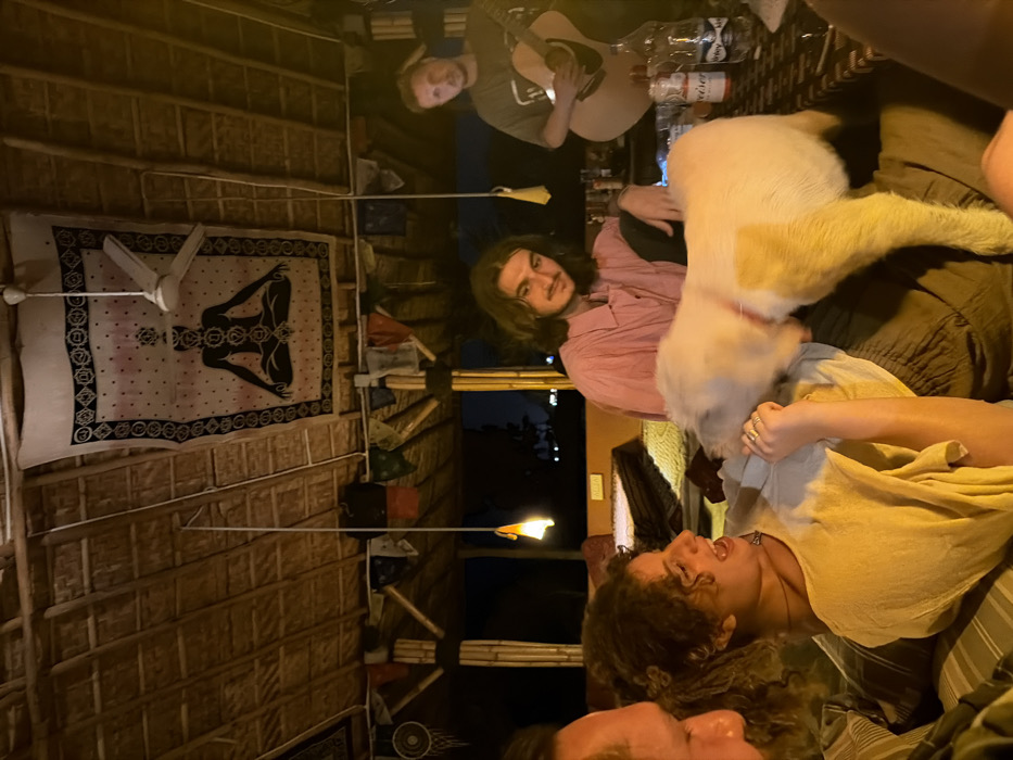 Inside a structure with thatched walls, a group of people are gathered. One person strums a guitar. Another sits nearby, while a third interacts with a large, light-colored dog. A tapestry featuring a yoga-like figure hangs on one wall, and a ceiling fan is visible. Bottles and cans are scattered on a table. The scene appears casual and dimly lit, capturing a moment of social interaction and relaxation.