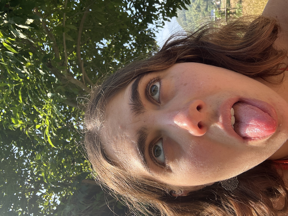 A woman with light skin, green eyes, and brown hair poses with her tongue out. The photo is taken from a low angle, showcasing her face prominently. Behind her, a tree's foliage provides a natural backdrop. Her expression is playful, with a hint of a smirk. The lighting suggests it's daytime, with sunlight dappling her skin.