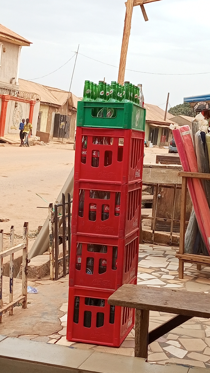 The scene depicts a street in Sabon Tasha, Nigeria, under an overcast sky. In the foreground, a stack of five plastic beverage crates stands on an irregularly tiled pavement. The bottom four crates are red, branded "Coca-Cola," and contain dark-colored bottles, likely Coca-Cola. The topmost crate is green and holds numerous empty green glass bottles, some bearing "STAR" labels, suggesting a brand of beer or soda. One clear, empty glass bottle is also present in the green crate. To the immediate right of the crate stack, a section of a rough wooden table or bench is visible. Further right, a taller wooden structure supports vertically rolled items, possibly mats or fabric, in various shades including pink, red, and blue. To the left of the crates, a rusted metal fence or railing separates the tiled area from a dirt path. In the mid-ground, two individuals are seen walking on the dirt path to the far left. One wears a blue top and dark trousers, while the other wears a patterned yellow and brown tunic over dark trousers. Their interaction is not discernible. Buildings of varying architectural styles and states of repair line the background, with corrugated metal roofs visible on some structures. A prominent light-colored building with orange trim and decorative elements is visible to the far left. Utility lines traverse the upper portion of the frame. A large wooden pole or beam extends diagonally upwards from the right side of the image, partially obscuring the sky. The overall lighting is diffused.