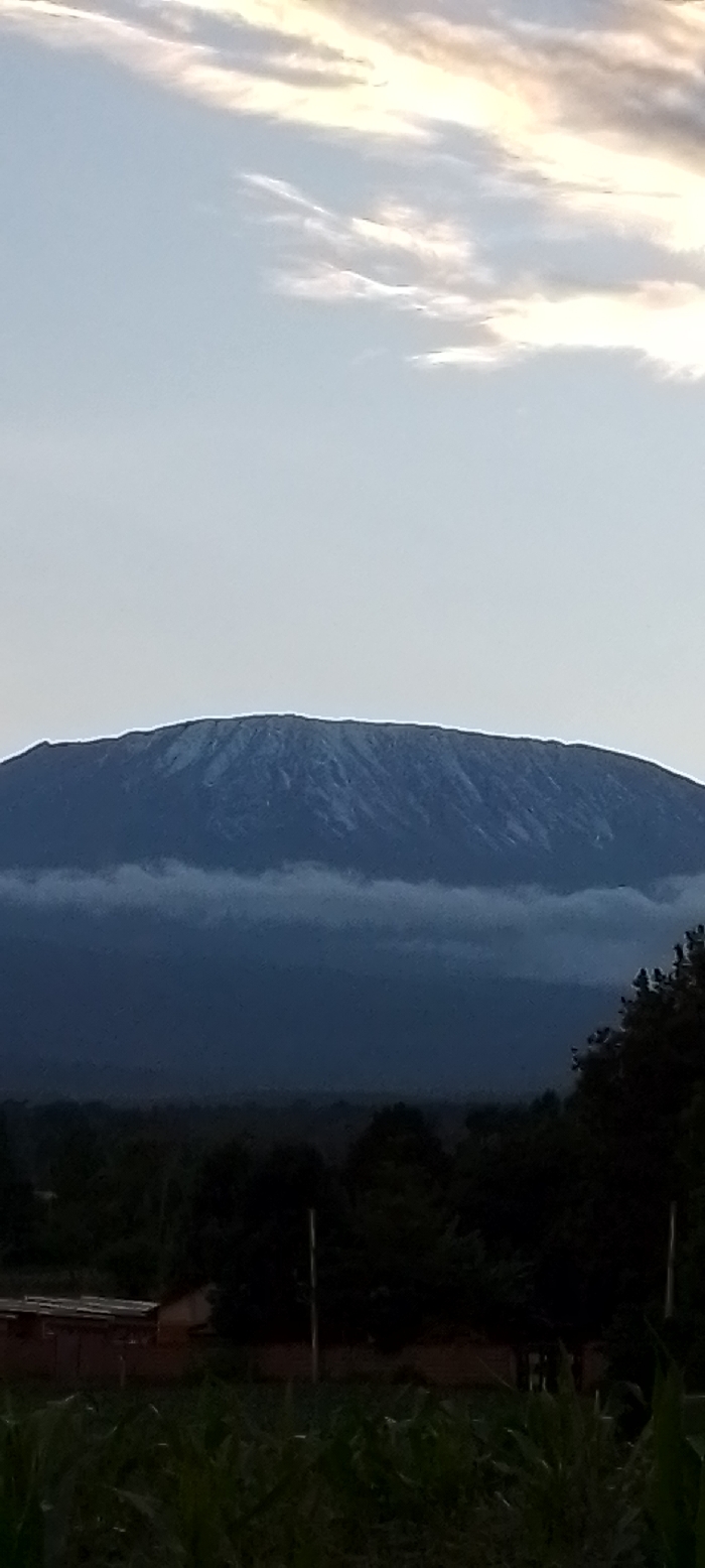This image depicts a rural landscape in Kuku ward, Kenya, at either dawn or dusk. The upper half of the frame shows a light blue sky transitioning to a yellowish-orange hue near the top, with scattered, thin stratocumulus clouds. Dominating the middle ground is a large, dark blue-grey mountain, likely Mount Kilimanjaro, with its flattened summit exhibiting patches of light-colored snow or ice. A distinct horizontal band of low-lying fog or cloud partially obscures the lower slopes of the mountain. Below this, a dark green-black tree line runs across the frame. In the lower left foreground, a single-story structure with a light-colored wall and a corrugated metal roof is visible. The immediate foreground consists of a cultivated field populated with green, leafy plants, possibly maize, with several thin, vertical poles (likely fence posts) interspersed. No people or animals are visible.