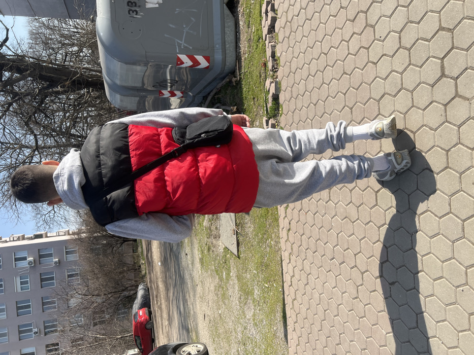 A male individual is depicted from the rear, walking on a paved pathway composed of hexagonal tiles in a residential area of Sofia, Bulgaria. He is dressed in a grey hooded sweatshirt, a red and black sleeveless puffer vest, grey sweatpants, white socks, and grey athletic shoes. A black shoulder bag is worn across his body, resting on his right hip. Bright sunlight casts a prominent shadow of the individual onto the pathway to his left. To the left of the pathway, an unpaved, dirt area with sparse green patches contains two parked vehicles: a red hatchback and another vehicle partially covered by a grey tarp. In the far left background, a multi-story, light grey apartment building with numerous windows, balconies, and exterior air conditioning units is visible. To the right of the pathway, two large, grey, industrial-style waste containers, featuring red and white diagonal striped markings and graffiti including the number "133," are situated next to bare deciduous trees. The scene suggests a sunny day in late winter or early spring within an urban setting.