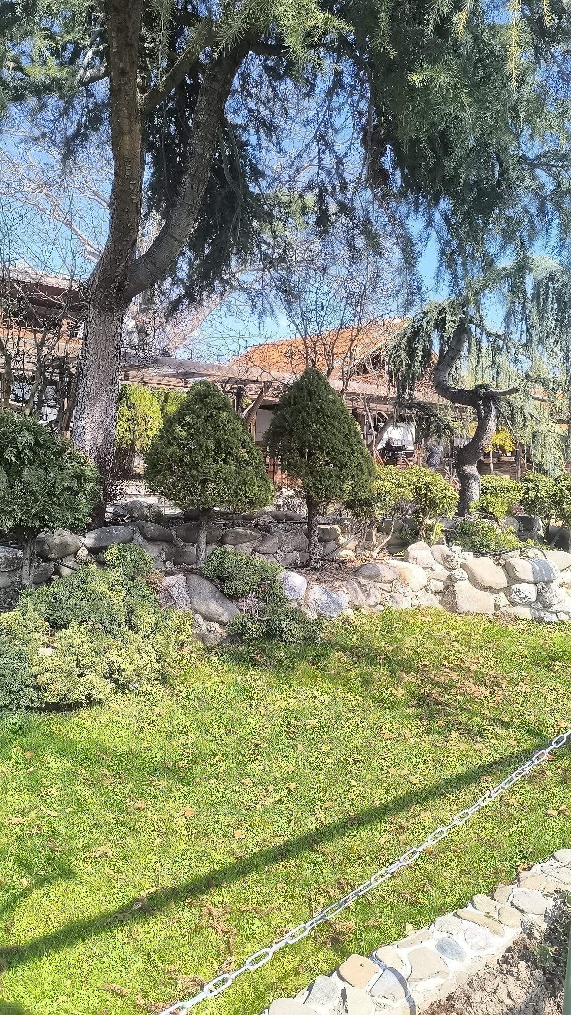 The image displays an outdoor garden or park setting in Skobelevo, Bulgaria, illuminated by clear daylight. In the foreground, a vibrant green lawn spans the lower portion of the frame, sparsely covered with scattered yellowish-brown deciduous leaves. A single strand of silver-colored chain, composed of interconnected oval links, runs diagonally from the lower right towards the center-left, acting as a low barrier. This chain borders a low, irregular dry-stone wall constructed from various light-toned rocks. Immediately behind this, a structured landscape feature rises, consisting of a robust retaining wall built from rounded, medium-grey boulders. Planted on and around this retaining wall are several small, conical evergreen trees, likely conifers, interspersed with numerous low-lying green shrubs and groundcover plants. The background is dominated by large, mature trees and a partial view of a building. On the left, a tall, thick tree trunk with dark, fissured bark supports a dense canopy of green needles. To the right, another large conifer, possibly a cedar, exhibits long, weeping green needles and several distinct cones hanging from its branches. Interspersed among these evergreens are deciduous trees with bare branches, suggesting late autumn or early spring. Behind the tree line, a building with a reddish-orange tile roof is partially visible. It features exposed wooden beams and what appears to be a rustic wooden pergola structure in front. The sky above, visible through gaps in the tree canopy, is clear and bright blue. Long, distinct shadows are cast across the grassy area, indicating a strong light source, likely the sun, from the upper left. No individuals or active interactions are discernible within the scene.