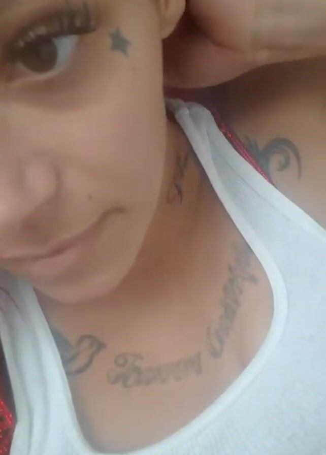 The video is a close-up selfie of a woman wearing a white tank top. She has red hair visible around the edges of the frame. She has a star tattoo on her face near her eye, noticeable fake eyelashes, and several tattoos on her chest and neck, including writing, a bird, and a swirling design. She sticks her tongue out briefly. The background appears to be a pink or red surface.