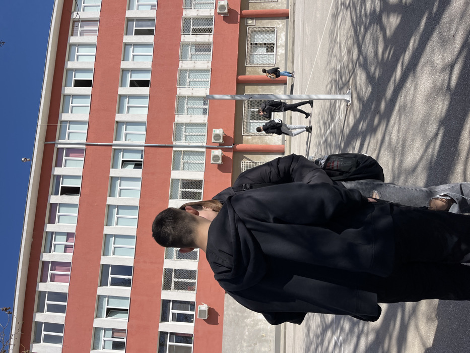The scene depicts an outdoor paved area in Panagyurishte, Bulgaria, in front of a multi-story building under a clear blue sky. In the immediate foreground, with their backs to the viewer, are two individuals. The closer individual is male, wearing a dark blue or black hooded sweatshirt and dark trousers, with short dark hair. Partially obscured by him is another individual wearing a dark puffer jacket, light grey ripped jeans, and carrying a black backpack on their left shoulder. Behind these individuals, a large building with a reddish-orange facade rises at least three visible stories. It features numerous rectangular windows with white frames; many are partially open, revealing interior blinds or curtains in various light colors such as white, light blue, and pink. The ground floor and first floor of the building exhibit multiple external air conditioning units mounted beneath windows. Some ground-floor windows are fitted with white security grates. A slender, metallic pole, possibly a flagpole, stands vertically in the paved area to the right of the central foreground figures, extending upward past the second floor of the building. Further into the mid-ground, several other individuals are present on the paved surface. Two young males are walking from left to right: one in a light grey top and dark trousers with a backpack, and another in a dark hooded sweatshirt and dark trousers, gesturing with his right hand near his head. Further back and to the right, a third individual in dark clothing and carrying a backpack is also walking. The paved ground is marked with numerous distinct, elongated shadows cast by unseen objects, indicating bright sunlight.