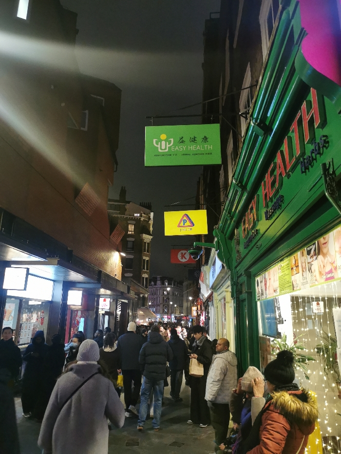 A bustling street scene at night features pedestrians walking along a narrow lane lined with buildings. Storefronts are visible, including one with a green facade and the words "EASY HEALTH" prominently displayed. Signs hang overhead, including one for "EASY HEALTH" in green and one that is yellow with a parking symbol. The lighting is a mix of artificial lights from the shops and the street, casting shadows and highlighting the crowd.