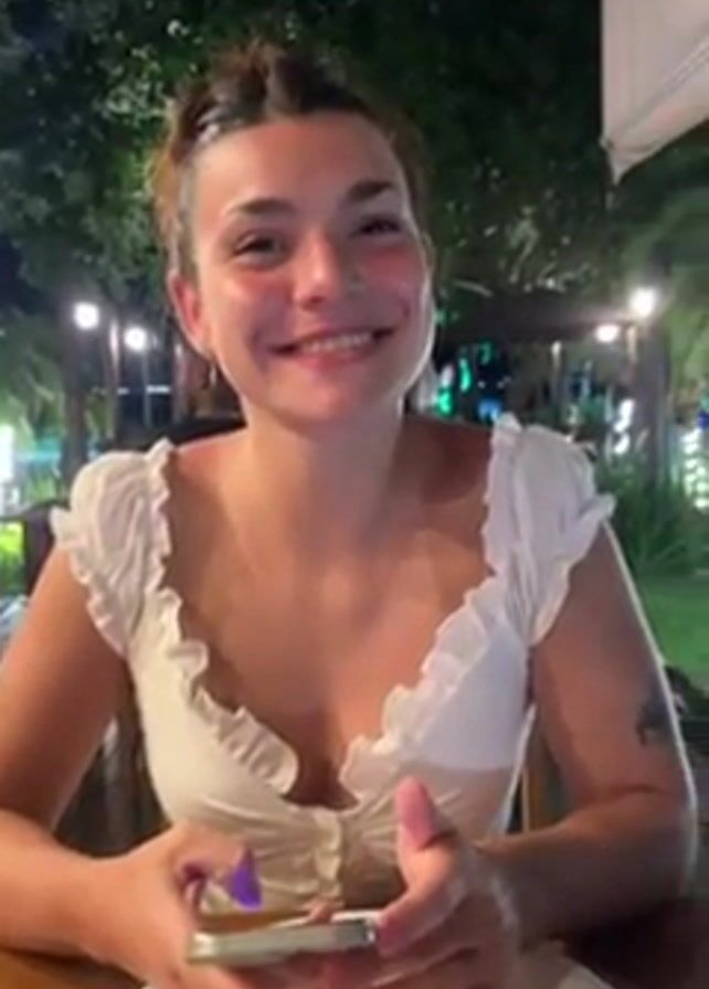 - ". The video starts with a close-up of a woman at a table holding a phone and smiling at the camera. She has light brown hair pulled back and is wearing a white top. There is a plate and silverware on the table in front of her. The camera quickly pans to the right to show an outdoor view at night. The scene includes a grassy area, a path with a red stripe, a wooden fence, palm trees adorned with lights, and boats docked in the water. In the distance, the dark outline of a town or city with some lights can be seen across the water. A few people are visible near the boats. The camera then focuses on the boats and the waterfront scenery." by FM-vIRwr1, licensed under CC BY 4.0