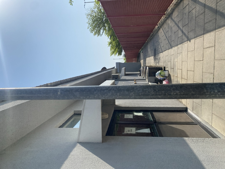 This image depicts an outdoor pathway running alongside a building, with a fence on the opposite side, under a clear blue sky, located in Inupa Kekere, Nigeria. **Building:** The structure on the left features a light gray, textured stucco facade. It has dark-framed double doors, likely glass, positioned centrally in the frame's left portion. Two white notices are affixed to the left door panel; one appears to include a "NO SMOKING" graphic. Above the doors, a light-colored rectangular awning or architectural element extends horizontally, with a horizontal window situated above it. Along the building's exterior, at least three square outdoor air conditioning condenser units are visible at ground level, with a white bucket and multiple plastic bags located near them. A single split-unit air conditioning condenser is mounted higher on the wall. A dark gray corrugated roof line is visible above the building's facade. **Pathway:** The ground is paved with rectangular light gray pavers, creating a walkway that runs parallel to the building. Distinct shadows are cast across the pathway, indicating bright sunlight. **Fence:** A tall, reddish-brown fence, composed of corrugated panels or a similar material, runs along the right side of the pathway, serving as a boundary. **Background:** Beyond the fence, the tops of green trees are visible, along with what appears to be a distant utility pole or telecommunications mast against the clear blue sky. **Foreground:** A prominent, vertical metallic pole, likely a lamppost or structural support, stands in the immediate foreground, partially obscuring the view of the building and pathway. **People/Actions:** No individuals are present in the scene, and no specific actions or interactions are depicted. **Environment:** The scene is brightly lit by natural sunlight, indicating daytime conditions.