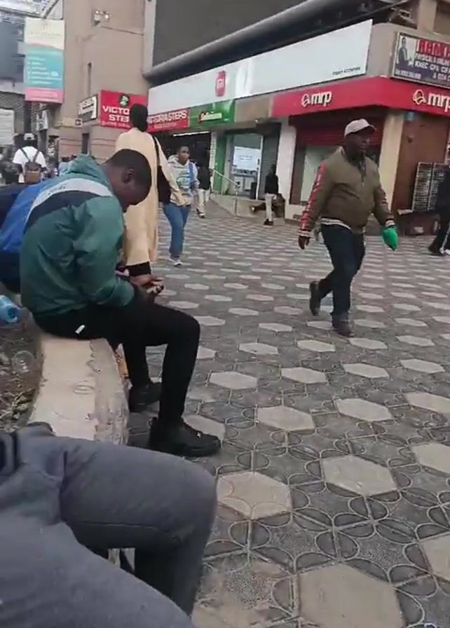 pedestrian walkway in what appears to be a city. The walkway is paved with interlocking grey and black hexagonal tiles. Several people are walking around the area, including a woman in green pants and a green shirt, and a man wearing a green jacket, black pants, and a baseball cap. There are buildings on either side of the walkway, with signs for ICS College and Tecno visible. Some of the buildings appear to have storefronts, some of which are closed. The weather looks overcast.