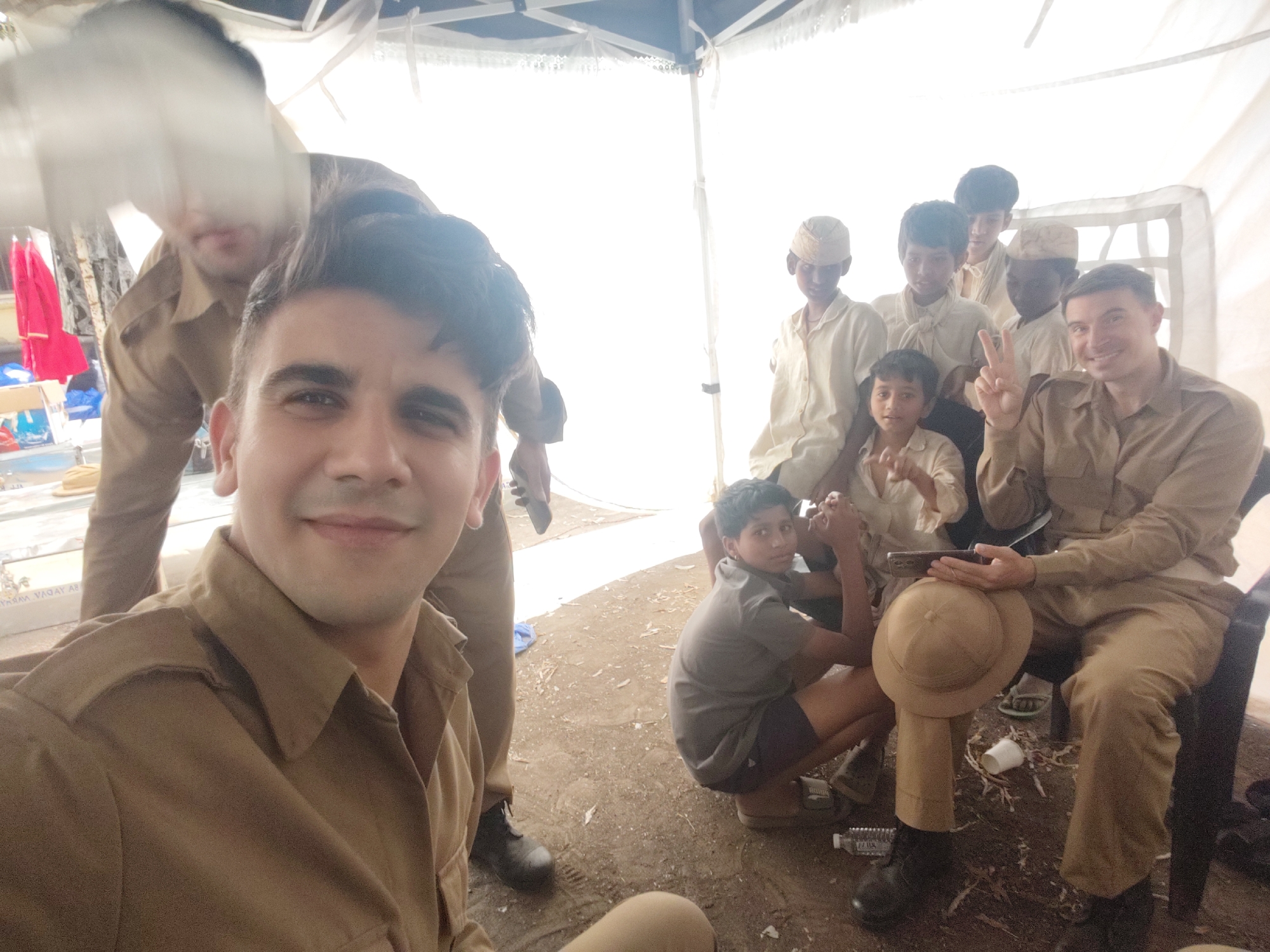 two men in khaki uniforms posing for a selfie with a group of young Indian boys inside a tent