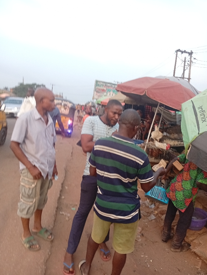 Three men stand on a dirt road, appearing to be in discussion near an outdoor market. The man on the left wears a light-colored shirt and cargo shorts. The middle man has a striped shirt and dark pants. The third man wears a striped shirt and yellow shorts, holding a blue basket. The market features various stalls and red umbrellas. Other individuals and vehicles are visible in the background under an overcast sky.