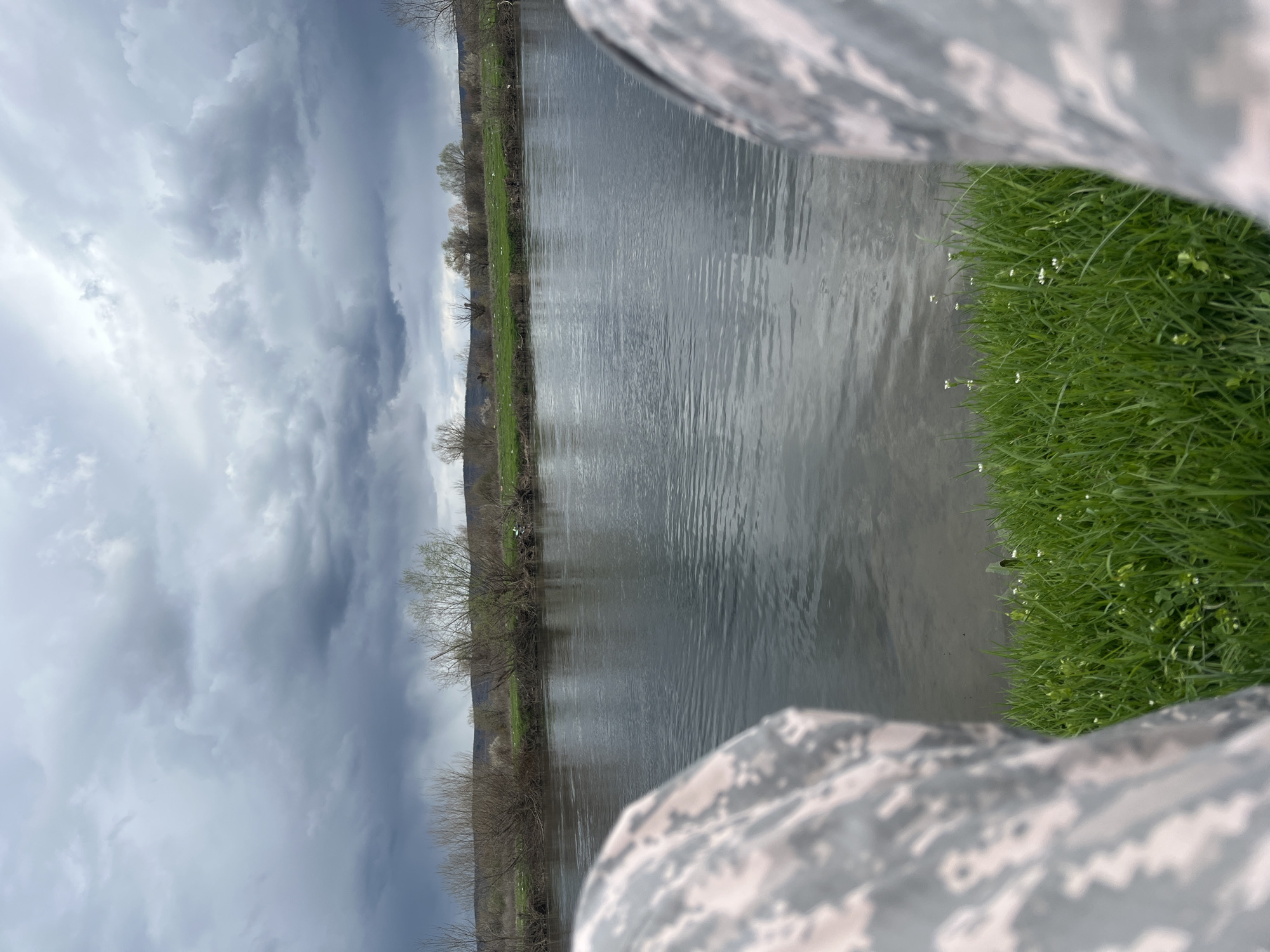 The scene, located in Koinare, Bulgaria, presents a first-person perspective of a tranquil riverine environment under an overcast sky. In the immediate foreground, the lower portions of two legs, clothed in light grey, white, and tan digital camouflage trousers, are visible on the left and right, partially obscuring the near shoreline. Between the legs, a patch of vibrant green grass with interspersed small white wildflowers leads to the water's edge. A wide river, its surface displaying subtle ripples and reflections of the cloudy sky, occupies the midground. The far bank features a strip of green grass bordered by numerous deciduous trees and bushes, many appearing bare or with nascent foliage. Scattered white debris is visible along this opposite bank. In the background, gently rolling terrain with sparse vegetation extends beneath a heavily overcast sky dominated by dark grey and lighter grey clouds. No individuals are fully visible, and no overt actions or interactions are depicted beyond the implied presence of the photographer.