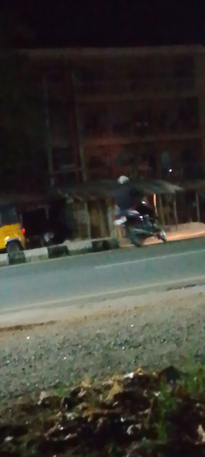 The image depicts a nighttime street scene in an urban environment within Zango-ndaji, Nigeria. The central focus is an asphalt roadway, bordered by a black and white striped curb or median. One individual, wearing a light-colored helmet and dark clothing, is operating a motorcycle and is captured in motion, traversing the road from right to left. To the far left, a yellow commercial tricycle (keke napep-type vehicle) is partially visible, facing away from the viewer. The background features dimly lit, multi-story buildings, partially obscured by a series of roadside stalls or makeshift structures with corrugated roofs. The immediate foreground consists of a gravelly ground area with scattered debris and sparse vegetation. The overall scene is dimly lit, consistent with nighttime, and exhibits some motion blur.