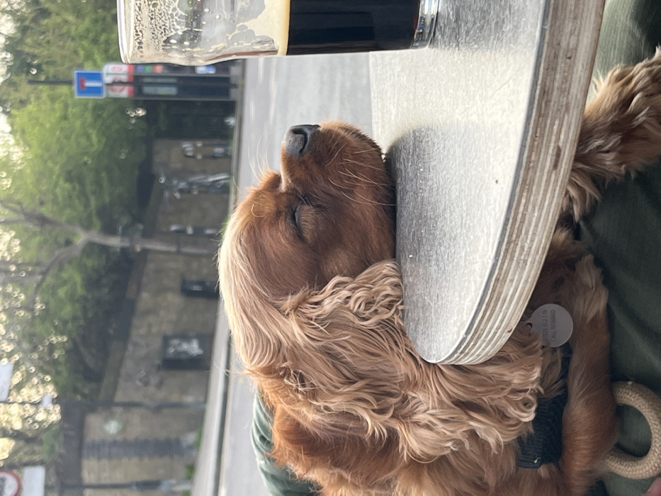 - "A reddish-brown, long-haired dog, identified as a Cavalier King Charles Spaniel or similar breed, is depicted resting its head on a round, light-grey table" by FM-KTvOE2, licensed under CC BY 4.0
