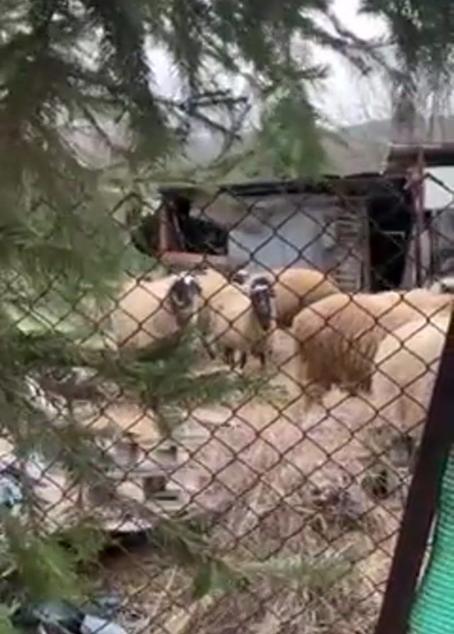 flock of sheep behind a wire fence. The sheep are mostly tan or beige, with some having black markings around their faces. They are clustered together in a fenced-in area that appears to be a yard or pasture. Behind the sheep, there's a dilapidated structure, possibly a shed or barn, with a mix of materials including wood and corrugated metal. The surrounding environment is rural, with a bare landscape of dry grass and leafless trees. In the foreground, there's a green pine tree branch partially obscuring the view, adding a natural element to the scene.