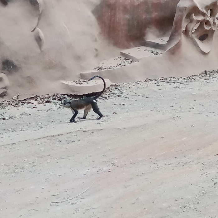 A medium-sized monkey is captured walking from left to right across a light-colored, dusty dirt path in the city of Unknown, Unknown. The quadrupedal animal exhibits dark fur on its limbs and a long tail that curls distinctly upwards at the tip. Its back displays lighter brown-grey fur, while its face and neck are pale. The ground consists of earth with scattered pebbles and debris. In the background, a reddish-brown, textured architectural or natural formation rises. This formation presents several horizontal steps or ledges on its left side and a highly eroded, organic structure with multiple depressions on its right, vaguely resembling a skull or abstract face. Scattered organic debris is visible on the ground and ledges. No human presence or other animals are observed, and no interactions are discernible within the scene.