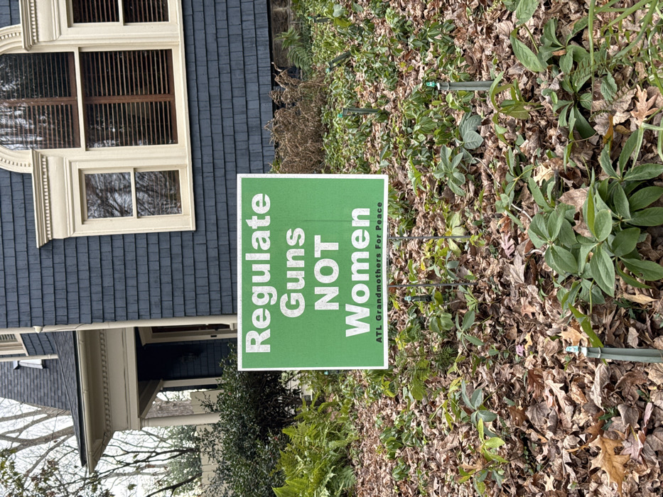 A green sign planted in foliage reads, "Regulate Guns NOT Women." Below this text, in smaller print, is "ATL Grandmothers For Peace." The sign is supported by several thin metal stakes. A gray, shingled house with white trim and windows is partially visible in the background. The scene is outdoors with fallen leaves and green plants.