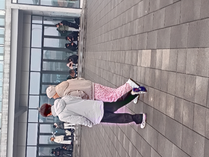 Two people are walking on a tiled surface in front of a building with large windows. The person in the foreground wears a gray jacket and dark pants, while the person behind wears a beige jacket and patterned pants. Additional people stand or sit in front of the building's windows. The perspective makes the tiled surface appear expansive. The overall atmosphere seems to be a public space or plaza adjacent to a building.