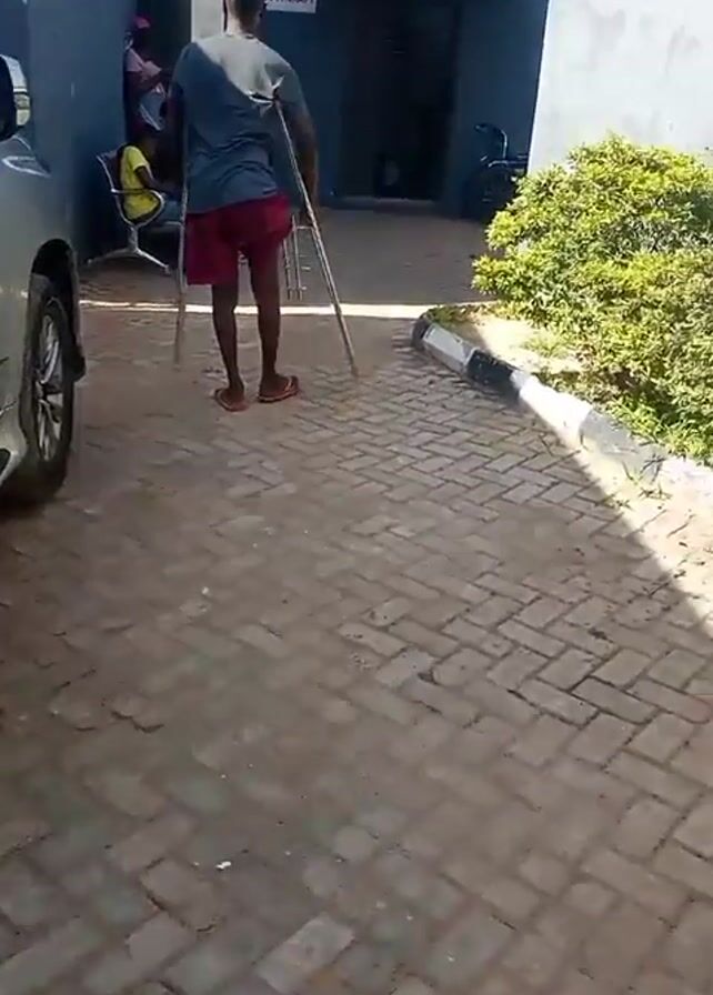 A man is walking away from the camera towards a building that says "Physiotherapy" on the sign above the door. He is using crutches, and appears to have an injury to his right leg, as his right foot does not touch the ground. He is wearing a grey t-shirt, red shorts, and orange flip-flops. There is a parked silver SUV to the left of the frame. Some people are sitting outside the building on a metal bench. A bicycle is visible near the entrance to the building. The ground is paved with light-red bricks.