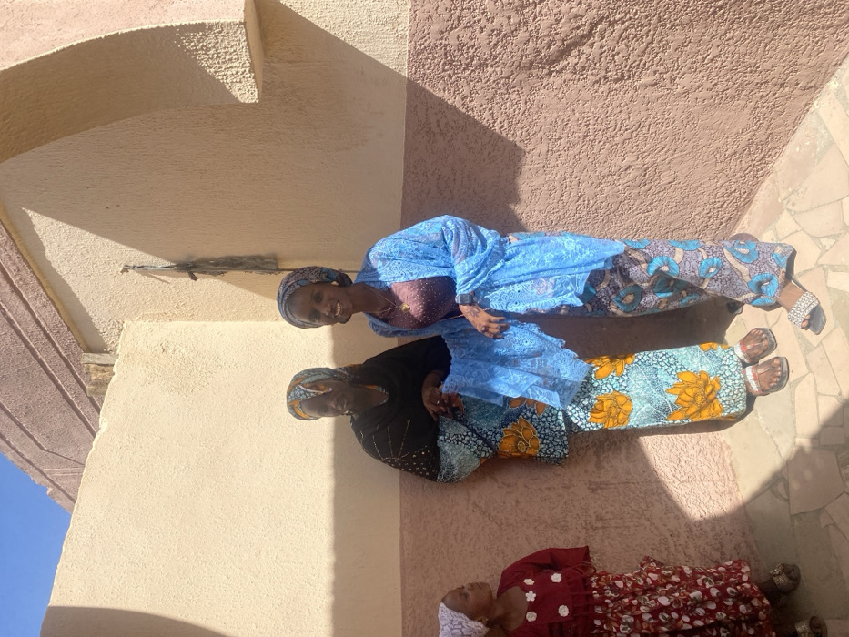 Three individuals, two adult females and one child, are standing outdoors in Chiranchi, Nigeria, against a textured wall corner under bright daylight