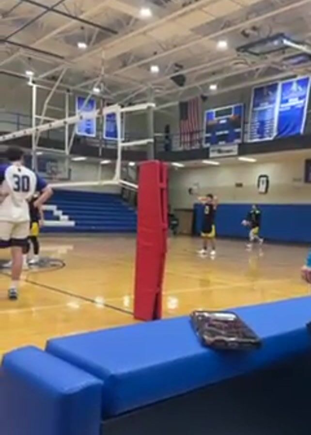 volleyball game taking place in a high school gymnasium. Several players are visible on the court, wearing either blue and white uniforms or black and yellow uniforms. The players are actively engaged in the game, moving around the court and interacting with the ball. The gymnasium has a shiny wooden floor, blue bleachers, and multiple banners and posters on the walls. A scoreboard can be seen in the background. The camera appears to be positioned on a table or bench near the sideline, with a smartphone and paperwork visible in the foreground.