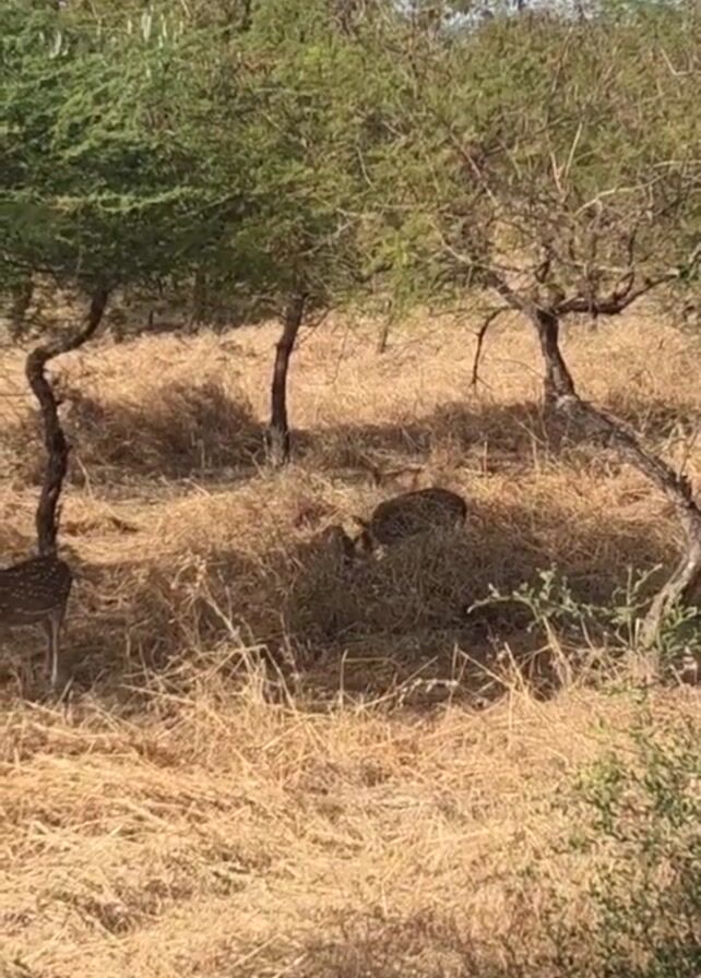 landscape with dry, golden-brown grass, several small, leafy green trees with thin trunks, and a glimpse of a light blue sky. Three spotted deer are visible among the trees and grass. One deer is standing on the left side of the frame, while the other two are resting or standing closer to the center. The scene is well-lit and seems to be captured in a natural setting.