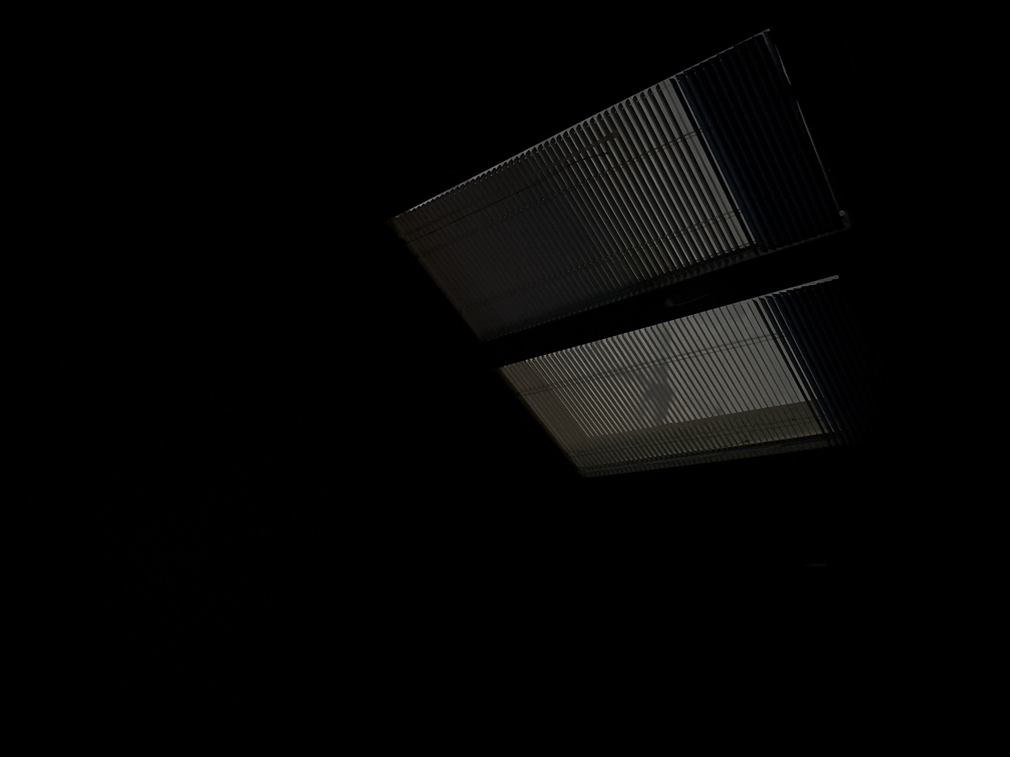 low-angle view of a building with corrugated metal siding in Sofia, Bulgaria. The building appears to be dark gray or black. The top section of the building is above the bottom section. The rest of the image is completely dark and black.