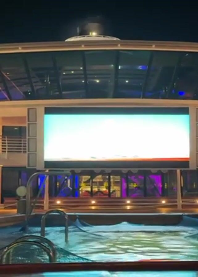 At night, the camera records a cruise ship deck where a swimming pool is covered with a safety net and lit with bright blue lights. Behind the pool is a large outdoor movie screen showing an action sequence, beginning with an image of a military vehicle before switching to a scene of a person with flames behind them. The deck behind the pool features decorative purple lighting and glass railings. Above the screen, the ship's upper deck is visible, also with glass elements.