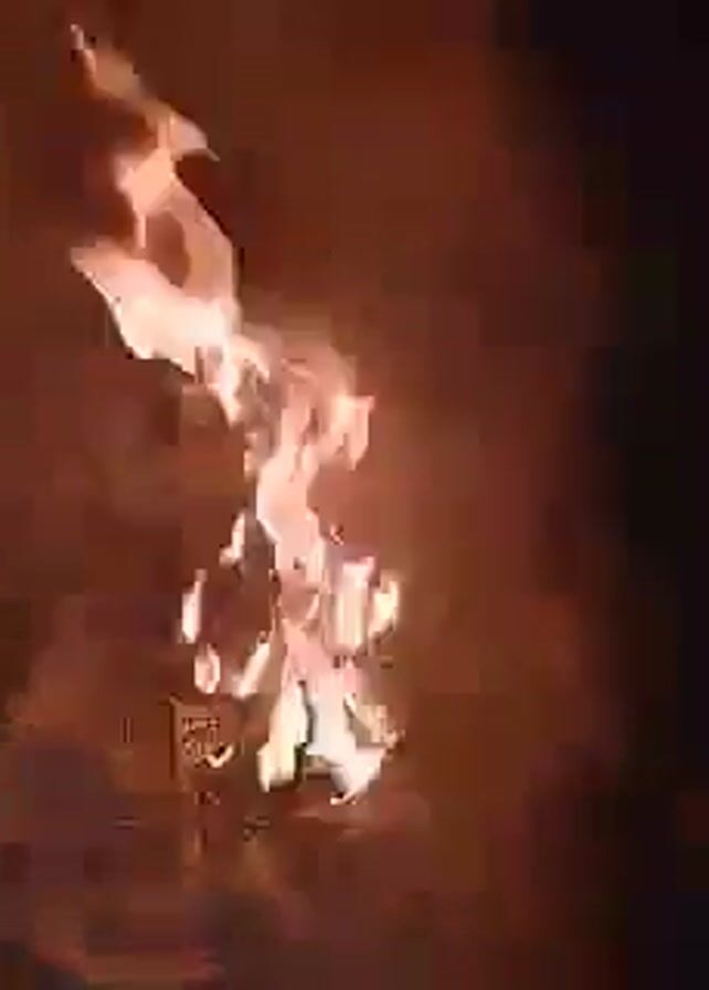 fire burning in a dark environment. The flames are orange and white, and appear to be consuming some type of material, potentially wood or other combustible items. An indistinct structure or pattern can be seen partially engulfed in the fire. Someone is speaking in the background, but the audio is unclear. The video quality is low.