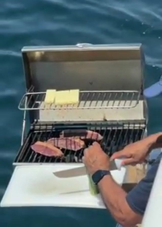A person wearing a navy blue shirt and a baseball cap is seen grilling on a boat on the open water