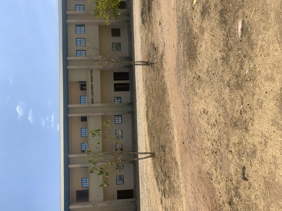 A three-story building with numerous windows is the main subject. A tree stands in front of the building, casting a long shadow across the grassy area. The ground appears dry and parched. The sky is light blue with a few scattered clouds. "NEEDS ASSESSMENT PROJECT 2023" is written on the building's facade.