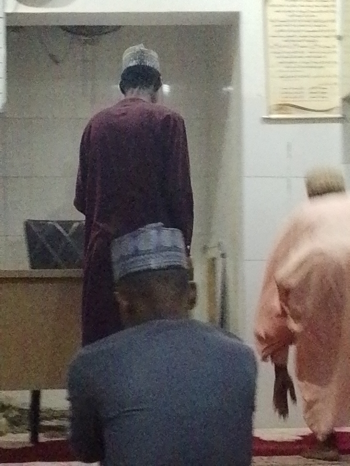 Three men are in a mosque. Two are wearing kufis, the traditional brimless cap. The man in the back is wearing a maroon robe, standing in front of a desk. The man in the center is wearing a dark gray shirt. The third man is wearing a pink robe, his arms at his side. All three men are facing the same direction. In the background is a white wall with a sign.