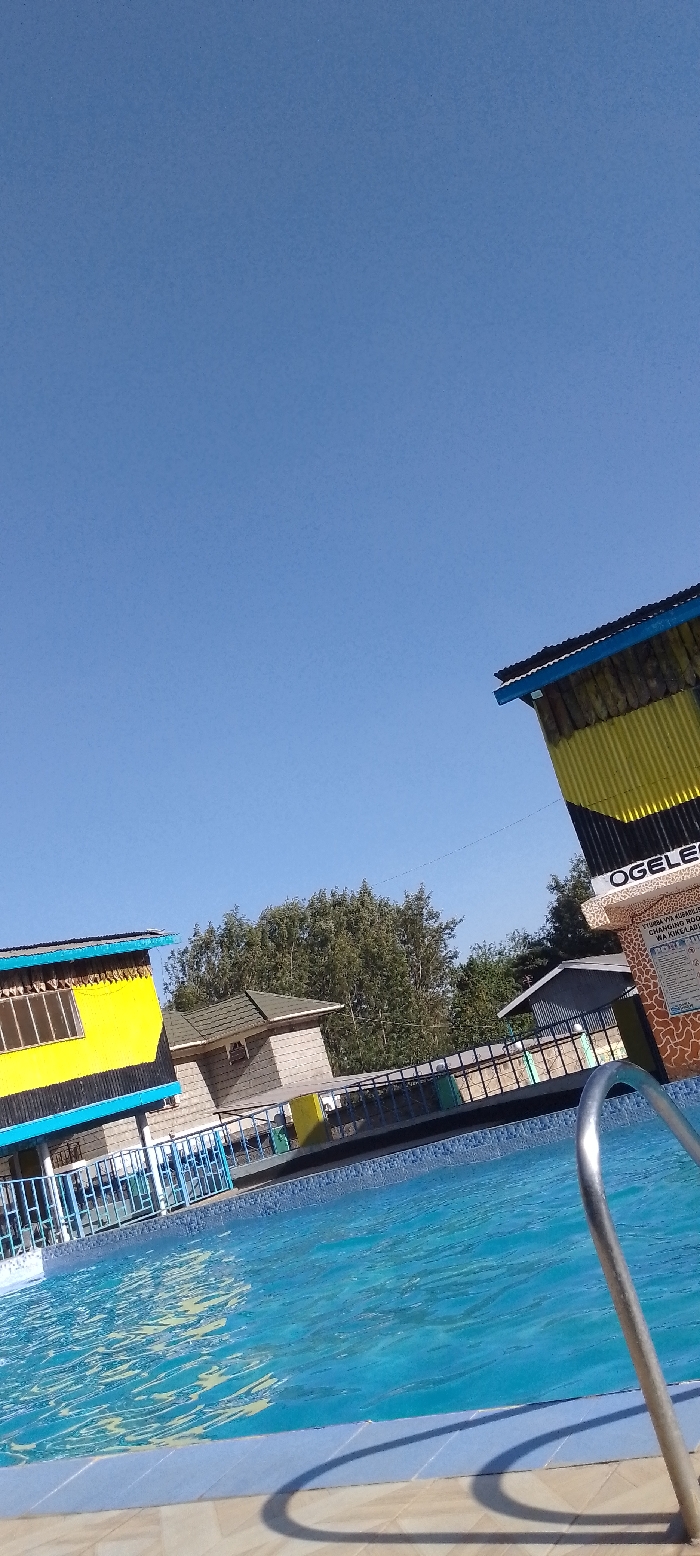 A bright, sunny day reveals a swimming pool surrounded by buildings. The pool's water is a clear blue, and a metal ladder is partially visible. The buildings are characterized by yellow and blue colors, with one structure displaying a sign. A line of trees is visible in the background, partially obscured by the buildings. The clear, blue sky takes up most of the frame.