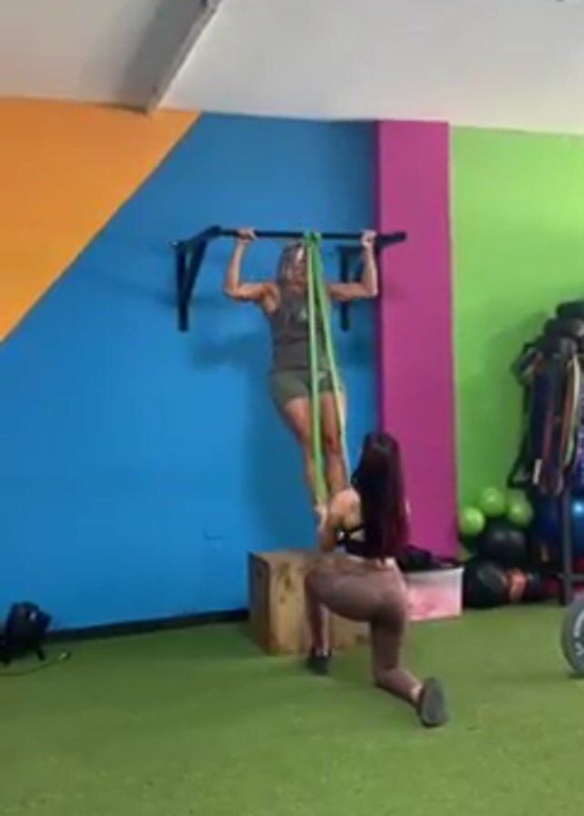 two women in a gym setting. One woman is standing on a wooden box beneath a pull-up bar, assisting the other woman with a pull-up exercise. The woman doing the pull-up has a green resistance band wrapped around the bar and under her feet, which the other woman is holding. The woman assisting is kneeling on the floor. The pull-up bar is mounted on a wall painted with blue, yellow, pink, and green sections. Gym equipment, including weights, exercise balls, and resistance bands, can be seen in the background. The gym floor is green.