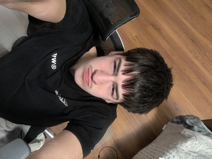 young male individual from an overhead perspective, appearing to be taking a selfie in an indoor environment. He is situated on a black mesh-backed chair, partially visible behind his left shoulder and head. The individual has short, dark hair styled with straight-cut bangs and a faint mustache. He wears a black short-sleeved t-shirt with a white "® TW" logo printed vertically on the chest and additional white script below it. His left arm is visible in the foreground, appearing flexed. His eyes are partially closed or squinting, and his head is slightly tilted. The floor is composed of light brown wooden planks. A light-colored, textured fabric item, possibly a towel, is visible on the floor in the lower right portion of the frame. A dark cable and a small circular object are on the floor in the lower left. The image contains no discernible landmarks or contextual clues to determine a specific location within Sofia, Bulgaria.