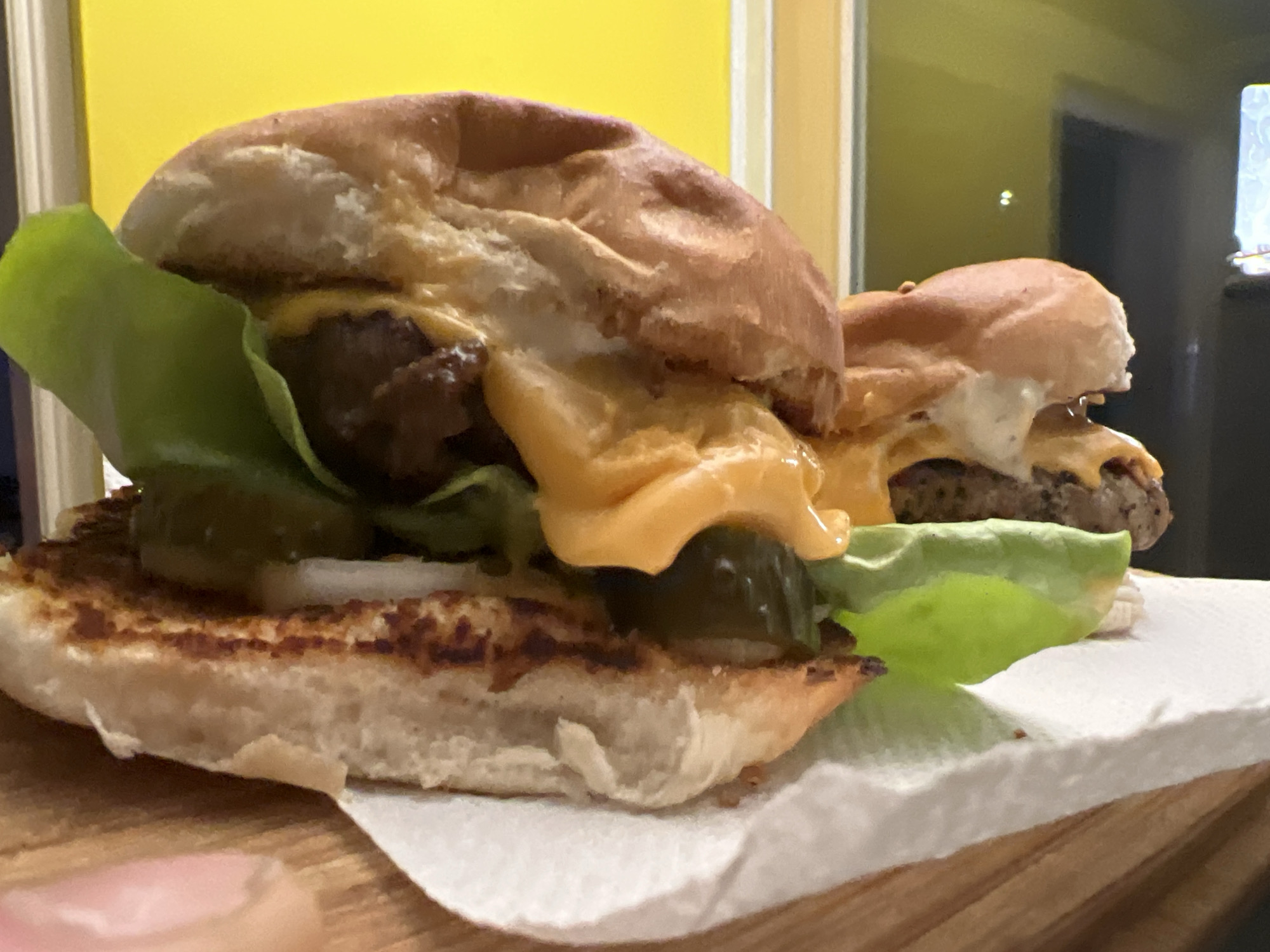 The scene is set indoors in Geldrop, Netherlands. Two cheeseburgers are presented on a white paper napkin, which rests on a light-colored wooden surface displaying visible grain. The dominant burger in the foreground is partially open, with its toasted bottom bun holding dark green circular pickle slices, white onion rings, and vibrant green lettuce leaves. A dark brown meat patty is positioned atop these ingredients, enveloped by melted orange-yellow cheese. The upper bun, lightly toasted, sits partially on the cheese and patty. A second, smaller cheeseburger is partially visible behind the first, also featuring a toasted bun, meat patty, lettuce, and a melted white sauce or cheese. The background consists of a bright yellow wall on the left, separated by a white vertical trim from a darker, olive-green wall on the right. A dark, rectangular opening, consistent with a doorway, is visible in the far-right background, containing a blurred light source or screen reflection. No individuals are present.