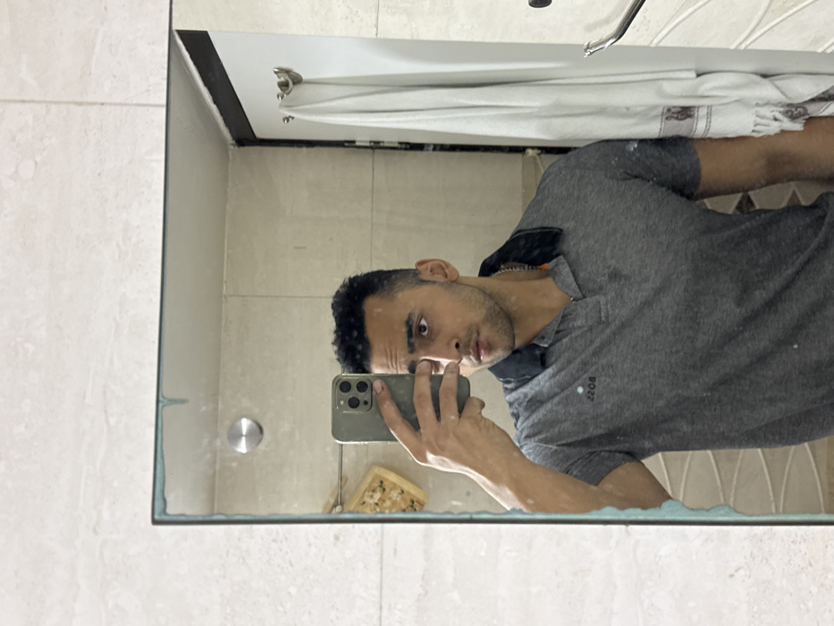 A young adult male, of light-brown complexion with short dark hair, is depicted taking a selfie in a mirror, holding a grey-cased smartphone with a multi-lens camera system in his right hand